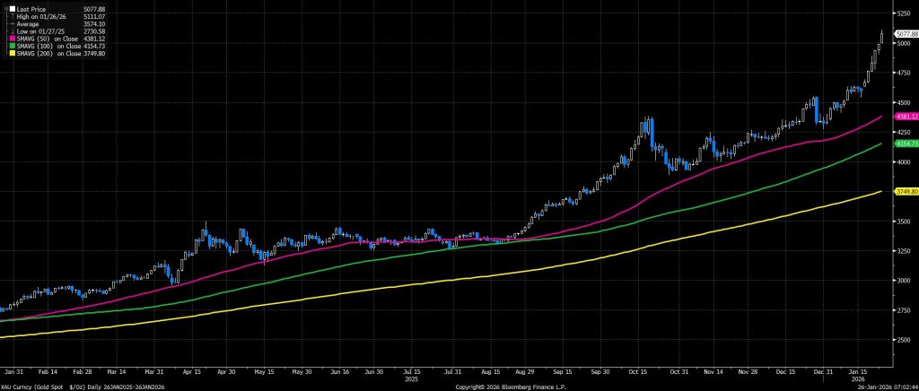 Vàng tiếp tục đà tăng mạnh, với giá giao ngay vượt mốc 5.000 USD/ounce lần đầu tiên trong lịch sử khi tuần giao dịch mới bắt đầu, giữa bối cảnh rủi ro địa chính trị vẫn dai dẳng và xu hướng “bán tháo tài sản Mỹ” ngày càng lan rộng.
