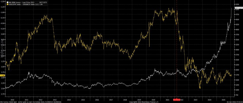 Yếu tố cơ cấu quan trọng nhất hỗ trợ giá vàng hiện nay vẫn là nhu cầu dự trữ, chủ yếu đến từ các ngân hàng trung ương thị trường mới nổi (EM), những bên đang tìm cách đa dạng hóa danh mục nắm giữ ra khỏi đồng USD và trái phiếu kho bạc Mỹ (USTs). Rõ ràng, đây không phải là điều mới mẻ: Ngân hàng Trung ương Trung Quốc (PBoC) đã mua vàng liên tục trong 14 tháng liền, và nhu cầu từ các nhà quản lý dự trữ này thực sự tăng mạnh kể từ giữa năm 2022 — thời điểm xảy ra vụ phong tỏa dự trữ ngoại hối của Nga. Chính sự kiện này đã làm đứt gãy mối tương quan truyền thống giữa giá vàng với lợi suất thực và lợi suất danh nghĩa.