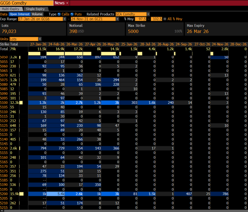 Thật ra, cố gắng đoán đỉnh là một việc gần như vô ích, đặc biệt khi xét đến thực tế rằng một mức cao kỷ lục thường kéo theo nhiều mức cao kỷ lục khác—điều này lại càng đúng hơn trong bối cảnh thị trường những năm gần đây vốn bị chi phối mạnh mẽ bởi đà tăng (momentum). Tuy nhiên, do giá vàng giao ngay hiện đã bước vào vùng “chưa từng có trên biểu đồ”, các mốc tròn vẫn có khả năng đóng vai trò như một mức kháng cự tâm lý nhất định, dù chỉ ở mức độ nào đó. Điều này đặc biệt rõ ràng khi có sự tập trung đáng kể của các quyền chọn đáo hạn quanh hai mốc 5.100 và 5.200 USD/ounce.